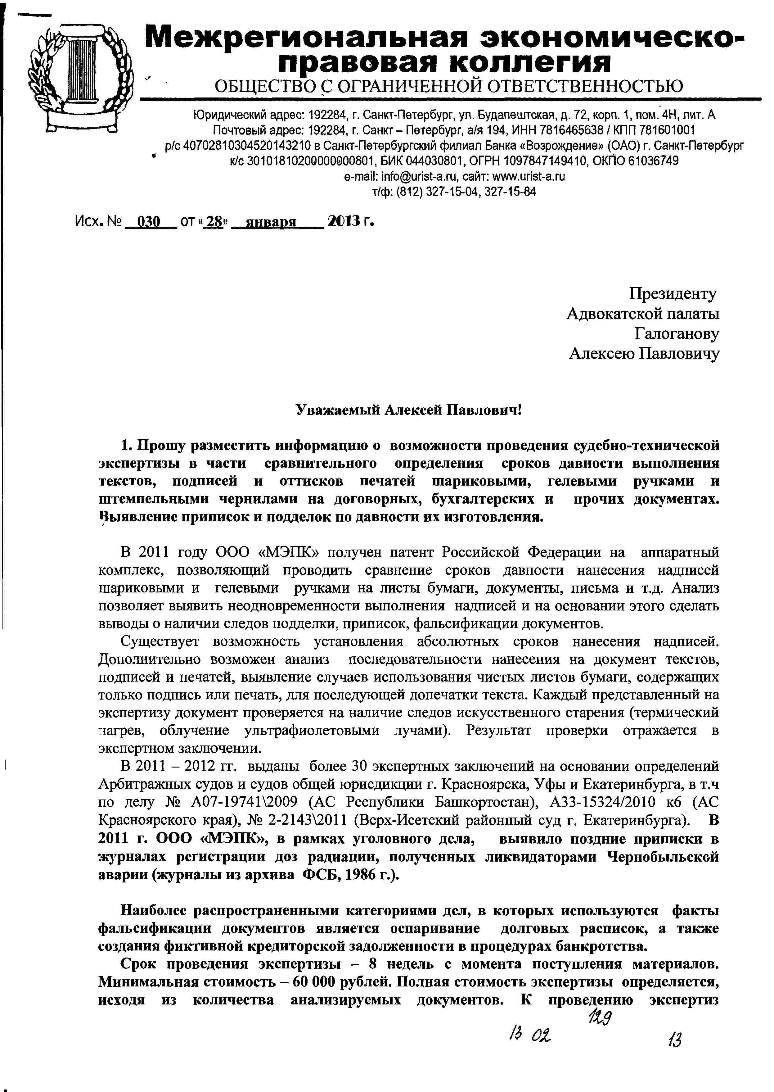 В своем письме зам.руководителя вышеуказанной коллегии просит разместить информацию о возможности проведения судебно-технической экспертизы в части сравнительного определения сроков давности выполнения текстов, подписей и оттисков печатей шариковыми, гелевыми ручками и штемпельными чернилами на договорных, бухгалтерских и прочих документах, выявления приписок и подделок по давности их изготовления.