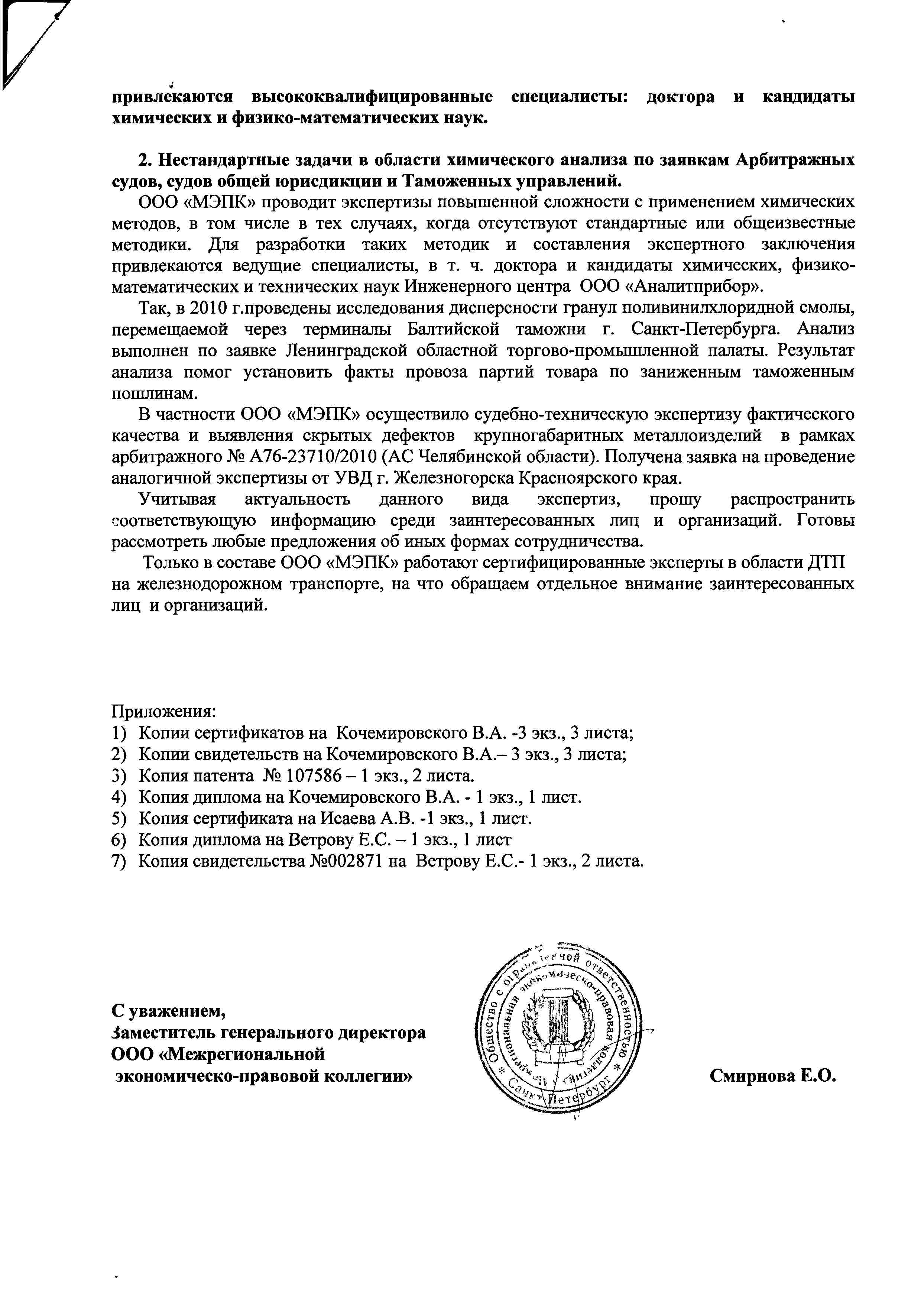 Письмо заместителя генерального директора ООО “Межрегиональной экономическо-правовой коллегии” Смирновой Е.О.